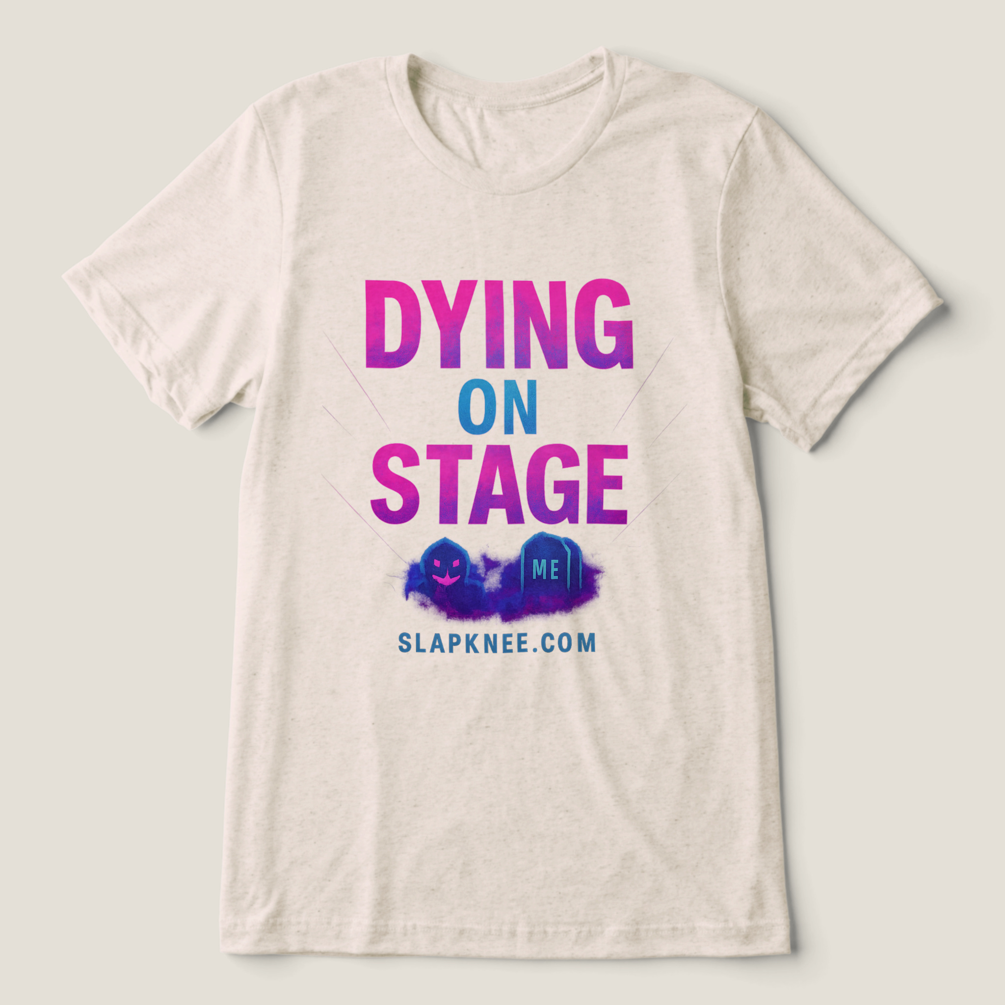 The Dying on Stage Tri-Blend Tee fuses raw neon artwork with a soft, vintage cut built for all-day wear. The front showcases a skeletal comic clutching the mic under glowing haze — a tragic, electric tribute to every set that dies in silence.